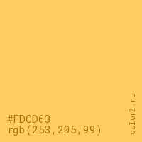 Цвет #FDCD63 в цветовой модели RGB обозначается тремя октетами (253, 205, 99) в десятичном формате и #FDCD63 в шестнадцатиричном (hex) формате, которые являются интенсивностью красного 253 (hex FD), интенсивность зелёного 205 (hex CD) и интенсивность синего 99 (hex 63).