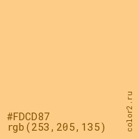Цвет #FDCD87 в цветовой модели RGB обозначается тремя октетами (253, 205, 135) в десятичном формате и #FDCD87 в шестнадцатиричном (hex) формате, которые являются интенсивностью красного 253 (hex FD), интенсивность зелёного 205 (hex CD) и интенсивность синего 135 (hex 87).