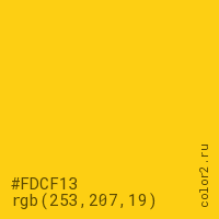 Цвет #FDCF13 в цветовой модели RGB обозначается тремя октетами (253, 207, 19) в десятичном формате и #FDCF13 в шестнадцатиричном (hex) формате, которые являются интенсивностью красного 253 (hex FD), интенсивность зелёного 207 (hex CF) и интенсивность синего 19 (hex 13).