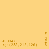 Цвет #FDD47E в цветовой модели RGB обозначается тремя октетами (253, 212, 126) в десятичном формате и #FDD47E в шестнадцатиричном (hex) формате, которые являются интенсивностью красного 253 (hex FD), интенсивность зелёного 212 (hex D4) и интенсивность синего 126 (hex 7E).