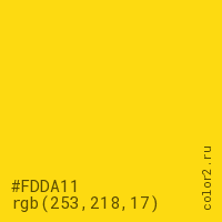 Цвет #FDDA11 в цветовой модели RGB обозначается тремя октетами (253, 218, 17) в десятичном формате и #FDDA11 в шестнадцатиричном (hex) формате, которые являются интенсивностью красного 253 (hex FD), интенсивность зелёного 218 (hex DA) и интенсивность синего 17 (hex 11).