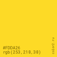 Цвет #FDDA26 в цветовой модели RGB обозначается тремя октетами (253, 218, 38) в десятичном формате и #FDDA26 в шестнадцатиричном (hex) формате, которые являются интенсивностью красного 253 (hex FD), интенсивность зелёного 218 (hex DA) и интенсивность синего 38 (hex 26).