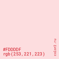 Цвет #FDDDDF в цветовой модели RGB обозначается тремя октетами (253, 221, 223) в десятичном формате и #FDDDDF в шестнадцатиричном (hex) формате, которые являются интенсивностью красного 253 (hex FD), интенсивность зелёного 221 (hex DD) и интенсивность синего 223 (hex DF).