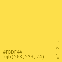 Цвет #FDDF4A в цветовой модели RGB обозначается тремя октетами (253, 223, 74) в десятичном формате и #FDDF4A в шестнадцатиричном (hex) формате, которые являются интенсивностью красного 253 (hex FD), интенсивность зелёного 223 (hex DF) и интенсивность синего 74 (hex 4A).