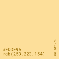 Цвет #FDDF9A в цветовой модели RGB обозначается тремя октетами (253, 223, 154) в десятичном формате и #FDDF9A в шестнадцатиричном (hex) формате, которые являются интенсивностью красного 253 (hex FD), интенсивность зелёного 223 (hex DF) и интенсивность синего 154 (hex 9A).