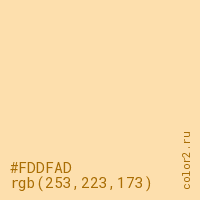 Цвет #FDDFAD в цветовой модели RGB обозначается тремя октетами (253, 223, 173) в десятичном формате и #FDDFAD в шестнадцатиричном (hex) формате, которые являются интенсивностью красного 253 (hex FD), интенсивность зелёного 223 (hex DF) и интенсивность синего 173 (hex AD).