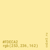 Цвет #FDECA2 в цветовой модели RGB обозначается тремя октетами (253, 236, 162) в десятичном формате и #FDECA2 в шестнадцатиричном (hex) формате, которые являются интенсивностью красного 253 (hex FD), интенсивность зелёного 236 (hex EC) и интенсивность синего 162 (hex A2).