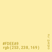 Цвет #FDEEA9 в цветовой модели RGB обозначается тремя октетами (253, 238, 169) в десятичном формате и #FDEEA9 в шестнадцатиричном (hex) формате, которые являются интенсивностью красного 253 (hex FD), интенсивность зелёного 238 (hex EE) и интенсивность синего 169 (hex A9).