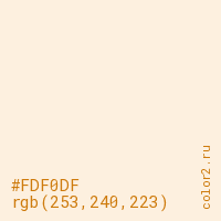 Цвет #FDF0DF в цветовой модели RGB обозначается тремя октетами (253, 240, 223) в десятичном формате и #FDF0DF в шестнадцатиричном (hex) формате, которые являются интенсивностью красного 253 (hex FD), интенсивность зелёного 240 (hex F0) и интенсивность синего 223 (hex DF).