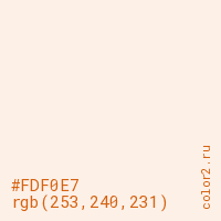 Цвет #FDF0E7 в цветовой модели RGB обозначается тремя октетами (253, 240, 231) в десятичном формате и #FDF0E7 в шестнадцатиричном (hex) формате, которые являются интенсивностью красного 253 (hex FD), интенсивность зелёного 240 (hex F0) и интенсивность синего 231 (hex E7).