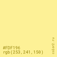 Цвет #FDF196 в цветовой модели RGB обозначается тремя октетами (253, 241, 150) в десятичном формате и #FDF196 в шестнадцатиричном (hex) формате, которые являются интенсивностью красного 253 (hex FD), интенсивность зелёного 241 (hex F1) и интенсивность синего 150 (hex 96).