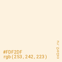Цвет #FDF2DF в цветовой модели RGB обозначается тремя октетами (253, 242, 223) в десятичном формате и #FDF2DF в шестнадцатиричном (hex) формате, которые являются интенсивностью красного 253 (hex FD), интенсивность зелёного 242 (hex F2) и интенсивность синего 223 (hex DF).