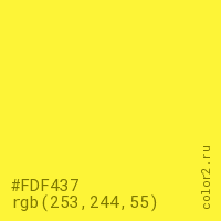 Цвет #FDF437 в цветовой модели RGB обозначается тремя октетами (253, 244, 55) в десятичном формате и #FDF437 в шестнадцатиричном (hex) формате, которые являются интенсивностью красного 253 (hex FD), интенсивность зелёного 244 (hex F4) и интенсивность синего 55 (hex 37).