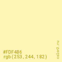 Цвет #FDF4B6 в цветовой модели RGB обозначается тремя октетами (253, 244, 182) в десятичном формате и #FDF4B6 в шестнадцатиричном (hex) формате, которые являются интенсивностью красного 253 (hex FD), интенсивность зелёного 244 (hex F4) и интенсивность синего 182 (hex B6).