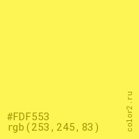 Цвет #FDF553 в цветовой модели RGB обозначается тремя октетами (253, 245, 83) в десятичном формате и #FDF553 в шестнадцатиричном (hex) формате, которые являются интенсивностью красного 253 (hex FD), интенсивность зелёного 245 (hex F5) и интенсивность синего 83 (hex 53).