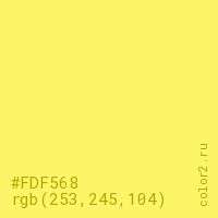 Цвет #FDF568 в цветовой модели RGB обозначается тремя октетами (253, 245, 104) в десятичном формате и #FDF568 в шестнадцатиричном (hex) формате, которые являются интенсивностью красного 253 (hex FD), интенсивность зелёного 245 (hex F5) и интенсивность синего 104 (hex 68).