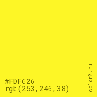 Цвет #FDF626 в цветовой модели RGB обозначается тремя октетами (253, 246, 38) в десятичном формате и #FDF626 в шестнадцатиричном (hex) формате, которые являются интенсивностью красного 253 (hex FD), интенсивность зелёного 246 (hex F6) и интенсивность синего 38 (hex 26).