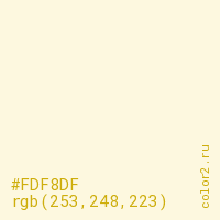 Цвет #FDF8DF в цветовой модели RGB обозначается тремя октетами (253, 248, 223) в десятичном формате и #FDF8DF в шестнадцатиричном (hex) формате, которые являются интенсивностью красного 253 (hex FD), интенсивность зелёного 248 (hex F8) и интенсивность синего 223 (hex DF).