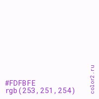 Цвет #FDFBFE в цветовой модели RGB обозначается тремя октетами (253, 251, 254) в десятичном формате и #FDFBFE в шестнадцатиричном (hex) формате, которые являются интенсивностью красного 253 (hex FD), интенсивность зелёного 251 (hex FB) и интенсивность синего 254 (hex FE).