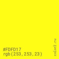 Цвет #FDFD17 в цветовой модели RGB обозначается тремя октетами (253, 253, 23) в десятичном формате и #FDFD17 в шестнадцатиричном (hex) формате, которые являются интенсивностью красного 253 (hex FD), интенсивность зелёного 253 (hex FD) и интенсивность синего 23 (hex 17).