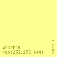 Цвет #FDFF90 в цветовой модели RGB обозначается тремя октетами (253, 255, 144) в десятичном формате и #FDFF90 в шестнадцатиричном (hex) формате, которые являются интенсивностью красного 253 (hex FD), интенсивность зелёного 255 (hex FF) и интенсивность синего 144 (hex 90).