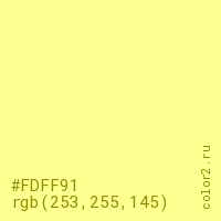 Цвет #FDFF91 в цветовой модели RGB обозначается тремя октетами (253, 255, 145) в десятичном формате и #FDFF91 в шестнадцатиричном (hex) формате, которые являются интенсивностью красного 253 (hex FD), интенсивность зелёного 255 (hex FF) и интенсивность синего 145 (hex 91).