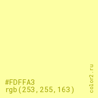 Цвет #FDFFA3 в цветовой модели RGB обозначается тремя октетами (253, 255, 163) в десятичном формате и #FDFFA3 в шестнадцатиричном (hex) формате, которые являются интенсивностью красного 253 (hex FD), интенсивность зелёного 255 (hex FF) и интенсивность синего 163 (hex A3).