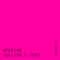 Цвет #FE01A0 в цветовой модели RGB обозначается тремя октетами (254, 1, 160) в десятичном формате и #FE01A0 в шестнадцатиричном (hex) формате, которые являются интенсивностью красного 254 (hex FE), интенсивность зелёного 1 (hex 01) и интенсивность синего 160 (hex A0).