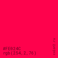 Цвет #FE024C в цветовой модели RGB обозначается тремя октетами (254, 2, 76) в десятичном формате и #FE024C в шестнадцатиричном (hex) формате, которые являются интенсивностью красного 254 (hex FE), интенсивность зелёного 2 (hex 02) и интенсивность синего 76 (hex 4C).
