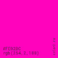 Цвет #FE02BC в цветовой модели RGB обозначается тремя октетами (254, 2, 188) в десятичном формате и #FE02BC в шестнадцатиричном (hex) формате, которые являются интенсивностью красного 254 (hex FE), интенсивность зелёного 2 (hex 02) и интенсивность синего 188 (hex BC).