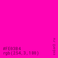 Цвет #FE03B4 в цветовой модели RGB обозначается тремя октетами (254, 3, 180) в десятичном формате и #FE03B4 в шестнадцатиричном (hex) формате, которые являются интенсивностью красного 254 (hex FE), интенсивность зелёного 3 (hex 03) и интенсивность синего 180 (hex B4).