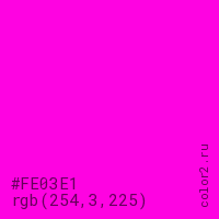 Цвет #FE03E1 в цветовой модели RGB обозначается тремя октетами (254, 3, 225) в десятичном формате и #FE03E1 в шестнадцатиричном (hex) формате, которые являются интенсивностью красного 254 (hex FE), интенсивность зелёного 3 (hex 03) и интенсивность синего 225 (hex E1).