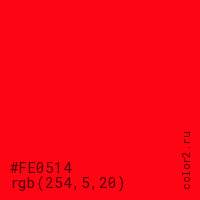 Цвет #FE0514 в цветовой модели RGB обозначается тремя октетами (254, 5, 20) в десятичном формате и #FE0514 в шестнадцатиричном (hex) формате, которые являются интенсивностью красного 254 (hex FE), интенсивность зелёного 5 (hex 05) и интенсивность синего 20 (hex 14).