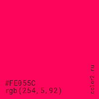 Цвет #FE055C в цветовой модели RGB обозначается тремя октетами (254, 5, 92) в десятичном формате и #FE055C в шестнадцатиричном (hex) формате, которые являются интенсивностью красного 254 (hex FE), интенсивность зелёного 5 (hex 05) и интенсивность синего 92 (hex 5C).