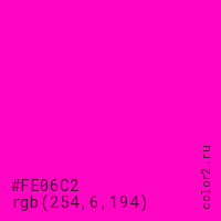 Цвет #FE06C2 в цветовой модели RGB обозначается тремя октетами (254, 6, 194) в десятичном формате и #FE06C2 в шестнадцатиричном (hex) формате, которые являются интенсивностью красного 254 (hex FE), интенсивность зелёного 6 (hex 06) и интенсивность синего 194 (hex C2).