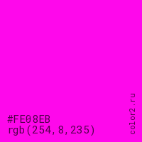 Цвет #FE08EB в цветовой модели RGB обозначается тремя октетами (254, 8, 235) в десятичном формате и #FE08EB в шестнадцатиричном (hex) формате, которые являются интенсивностью красного 254 (hex FE), интенсивность зелёного 8 (hex 08) и интенсивность синего 235 (hex EB).