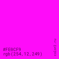 Цвет #FE0CF9 в цветовой модели RGB обозначается тремя октетами (254, 12, 249) в десятичном формате и #FE0CF9 в шестнадцатиричном (hex) формате, которые являются интенсивностью красного 254 (hex FE), интенсивность зелёного 12 (hex 0C) и интенсивность синего 249 (hex F9).