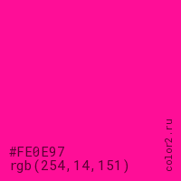Цвет #FE0E97 в цветовой модели RGB обозначается тремя октетами (254, 14, 151) в десятичном формате и #FE0E97 в шестнадцатиричном (hex) формате, которые являются интенсивностью красного 254 (hex FE), интенсивность зелёного 14 (hex 0E) и интенсивность синего 151 (hex 97).