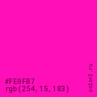 Цвет #FE0FB7 в цветовой модели RGB обозначается тремя октетами (254, 15, 183) в десятичном формате и #FE0FB7 в шестнадцатиричном (hex) формате, которые являются интенсивностью красного 254 (hex FE), интенсивность зелёного 15 (hex 0F) и интенсивность синего 183 (hex B7).