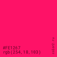 Цвет #FE1267 в цветовой модели RGB обозначается тремя октетами (254, 18, 103) в десятичном формате и #FE1267 в шестнадцатиричном (hex) формате, которые являются интенсивностью красного 254 (hex FE), интенсивность зелёного 18 (hex 12) и интенсивность синего 103 (hex 67).