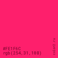 Цвет #FE1F6C в цветовой модели RGB обозначается тремя октетами (254, 31, 108) в десятичном формате и #FE1F6C в шестнадцатиричном (hex) формате, которые являются интенсивностью красного 254 (hex FE), интенсивность зелёного 31 (hex 1F) и интенсивность синего 108 (hex 6C).