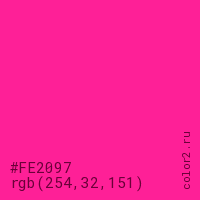 Цвет #FE2097 в цветовой модели RGB обозначается тремя октетами (254, 32, 151) в десятичном формате и #FE2097 в шестнадцатиричном (hex) формате, которые являются интенсивностью красного 254 (hex FE), интенсивность зелёного 32 (hex 20) и интенсивность синего 151 (hex 97).