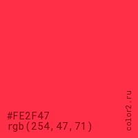 Цвет #FE2F47 в цветовой модели RGB обозначается тремя октетами (254, 47, 71) в десятичном формате и #FE2F47 в шестнадцатиричном (hex) формате, которые являются интенсивностью красного 254 (hex FE), интенсивность зелёного 47 (hex 2F) и интенсивность синего 71 (hex 47).