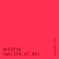 Цвет #FE2F50 в цветовой модели RGB обозначается тремя октетами (254, 47, 80) в десятичном формате и #FE2F50 в шестнадцатиричном (hex) формате, которые являются интенсивностью красного 254 (hex FE), интенсивность зелёного 47 (hex 2F) и интенсивность синего 80 (hex 50).