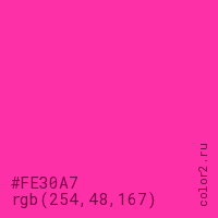 Цвет #FE30A7 в цветовой модели RGB обозначается тремя октетами (254, 48, 167) в десятичном формате и #FE30A7 в шестнадцатиричном (hex) формате, которые являются интенсивностью красного 254 (hex FE), интенсивность зелёного 48 (hex 30) и интенсивность синего 167 (hex A7).