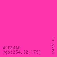 Цвет #FE34AF в цветовой модели RGB обозначается тремя октетами (254, 52, 175) в десятичном формате и #FE34AF в шестнадцатиричном (hex) формате, которые являются интенсивностью красного 254 (hex FE), интенсивность зелёного 52 (hex 34) и интенсивность синего 175 (hex AF).