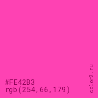 Цвет #FE42B3 в цветовой модели RGB обозначается тремя октетами (254, 66, 179) в десятичном формате и #FE42B3 в шестнадцатиричном (hex) формате, которые являются интенсивностью красного 254 (hex FE), интенсивность зелёного 66 (hex 42) и интенсивность синего 179 (hex B3).