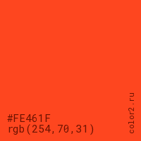 Цвет #FE461F в цветовой модели RGB обозначается тремя октетами (254, 70, 31) в десятичном формате и #FE461F в шестнадцатиричном (hex) формате, которые являются интенсивностью красного 254 (hex FE), интенсивность зелёного 70 (hex 46) и интенсивность синего 31 (hex 1F).