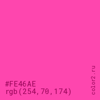 Цвет #FE46AE в цветовой модели RGB обозначается тремя октетами (254, 70, 174) в десятичном формате и #FE46AE в шестнадцатиричном (hex) формате, которые являются интенсивностью красного 254 (hex FE), интенсивность зелёного 70 (hex 46) и интенсивность синего 174 (hex AE).