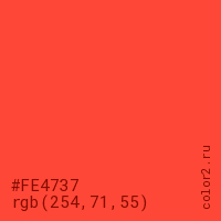 Цвет #FE4737 в цветовой модели RGB обозначается тремя октетами (254, 71, 55) в десятичном формате и #FE4737 в шестнадцатиричном (hex) формате, которые являются интенсивностью красного 254 (hex FE), интенсивность зелёного 71 (hex 47) и интенсивность синего 55 (hex 37).